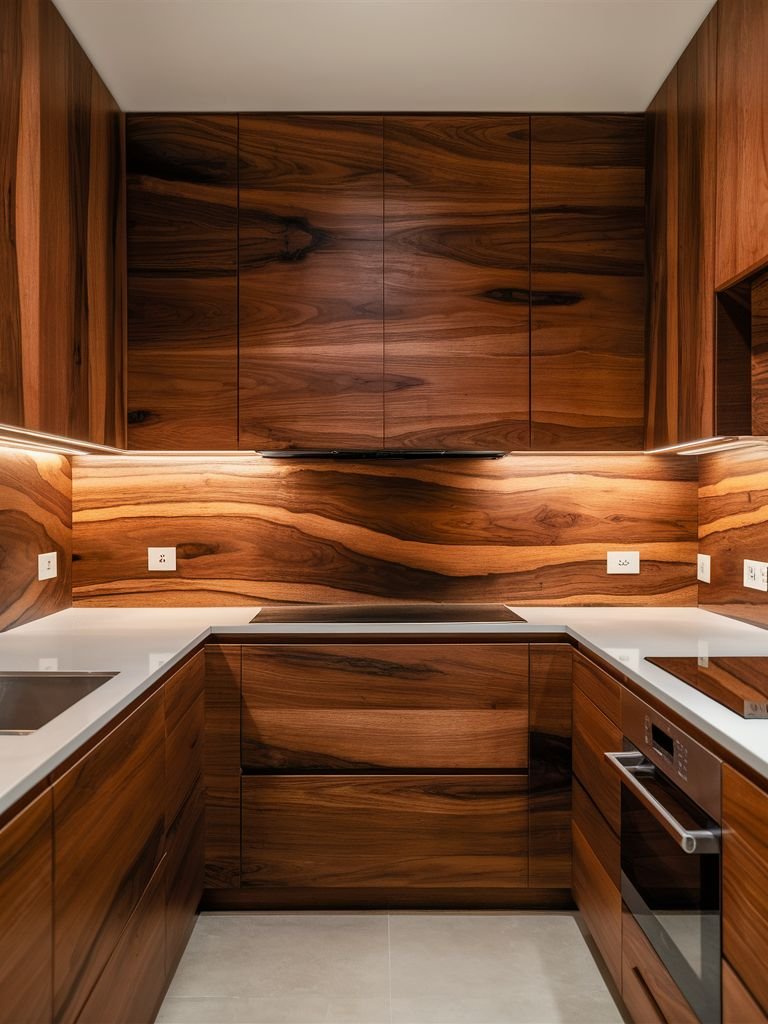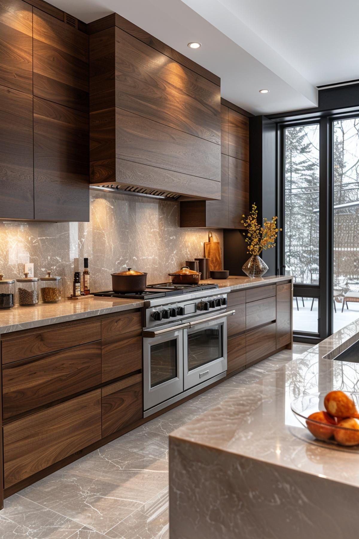Diseño contemporáneo con madera de nogal, isla central y acabados en cuarzo.