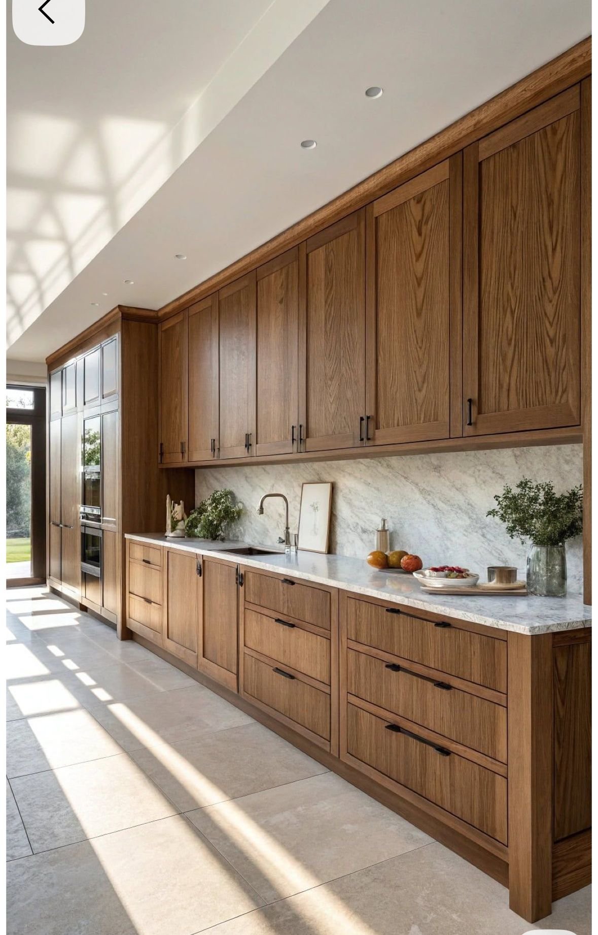 Líneas limpias, muebles altos y acabados en blanco mate con detalles en madera.