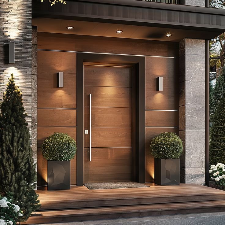 Puertas dobles con detalles en relieve y acabado natural.